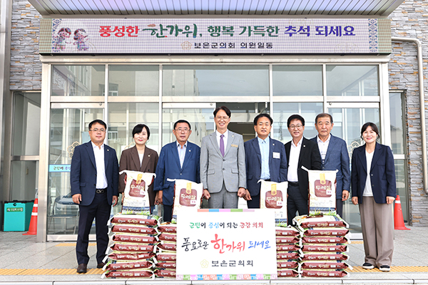 보은군의회(의장 윤대성)는 지난 9월 26일 추석 명절을 맞아 보은 전통시장을 찾아 장보기 행사를 진행하고, 이어 보은군장애인단체연합회를 방문해 위문품을 전달했다. 윤대성 의장을 비롯한 의원들과 의회사무과 직원들은 전통시장에서 직접 물품을 구매하며 시장 상인들과 소통하고, 지역 상권 활성화와 소비 촉진 분위기 확산에 힘을 보탰다. 윤대성 의장은 “세계 경제 악화로 지역 경기가 어려운 상황 속에서 소상공인 여러분의 노고가 크다는 말씀을 들었다”며 “이번 장보기 행사가 전통시장과 지역 경제에 작은 보탬이 되길 바라며, 군민 모두가 풍성하고 따뜻한 추석 명절을 보내시길 바란다”고 말했다. 이날 보은군의회는 소외되기 쉬운 이웃들에게 관심과 나눔을 실천하고자 보은군장애인단체연합회를 방문해 위문품을 전달하고, 장애인 복지 현장의 목소리를 경청하는 시간도 가졌다. 사진 좌측부터 성제홍 의원, 장은영 의원, 김응철 부의장, 윤대성 의장, 이경노 의원, 최부림 의원, 윤석영 의원, 김도화 의원.