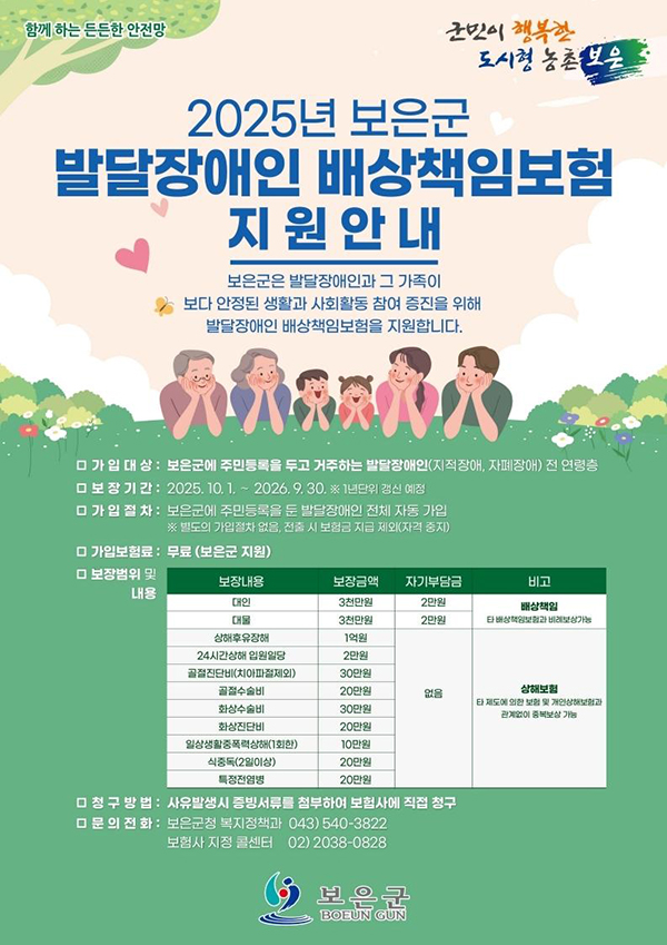 보은군이 발달장애인의 사회활동 안전망을 강화하기 위해 충북도내 최초로 ‘발달장애인 배상책임보험’ 지원사업을 10월 1일부터 시행한다고 밝혔다.