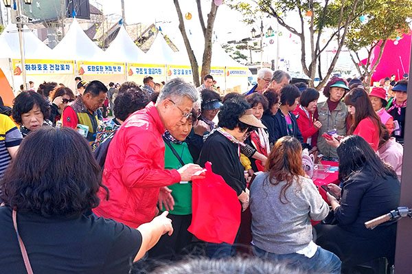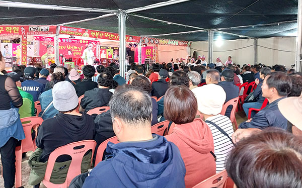 그날의 피날레를 장식하는 가수들의 공연이 큰 인기다. 개막 축하공연에서 많은 관객들의 환호 속에 박서진, 나상도, 나태주, 정서주, 배아현, 미스김, 곽지은 등 인기 가수들이 출연해 흥겨운 무대를 선사하며 축제 열기를 한껏 끌어 올린데 이어 이튿날 허각과 나비가 뱃들공원 주무대에 오른 폴인러브 공연을 선보였다, 축제 삼일째인 19일 일요일 오후 7시 히든싱어 모창가수 김건모, 박미경, 임창정, 소찬휘가 출연한 공연도 관람석을 꽉 메우는 등 큰 호응이 이어졌다. 한 관객은 “이들의 흥겨운 무대에 스트레스가 날아간 것 같다”고 했다. 보은군민의날 축하공연 또한 트로트 가수 김수찬과 류원정이 무대에 올라 행사 분위기를 절정으로 끌어 올렸는데 이날 출연 가수들 팬클럽 회원들이 몰려 축제 공연장이 사람들로 북적였다. 사진 위쪽은 지난 18일 오후 7시 열린 폴인러브 공연에 관객들이 꽉 들어차 있다. 아래는 지난 17일 보은군민의날 행사 때 트로트 가수 김수찬 팬클럽 회원들이 팬클럽 가입 신청을 받고 있다.