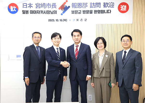 대한민국 대표 농특산물 축제인 ‘2025 보은대추축제’에 일본 자매도시 미야자키시 기요야마 토모노리 시장(좌측서 두 번째)을 비롯한 대표단이 방문해 양 도시 간의 굳건한 우호 관계를 재확인하고 교류 확대 방안을 논의했다. 이들은 16일 보은군청에서 양 도시의 상호 발전 방안에 대해 심도 있는 의견을 나눈데 이어 17일에는 법주사와 속리산 테마파크, 국가무형문화재 낙화장 전시장을 둘러보며 지역의 문화와 전통을 체험했다. 또 ‘보은대추축제’ 개막식 주요 내빈으로 참석해 축제를 축하하고 군민들에게 따뜻한 인사를 전했다. 대표단은 대추축제장을 돌아보며 활기찬 현장 분위기를 직접 체험하기도 했다. 최재형 군수는 “이번 방문이 양 도시 간에 더욱 실질적이고 미래지향적인 협력을 확대하는 계기가 될 것으로 확신한다”고 밝혔다. 기요야마 토모노리 시장은 “보은군과의 오랜 우정을 바탕으로 앞으로도 문화, 교육 등 다양한 분야에서 상호 발전하는 협력 관계를 지속해 나가겠다”고 화답했다. 한편 보은군과 미야자키시는 1993년 자매결연을 맺고 올해로 33주년을 맞이하고 있다.