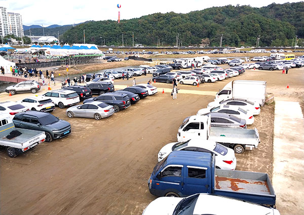 축제 3일째일 19일 일요일 오후 3시 30분. 보청천 고수부지에 마련된 하상주차장이 축제장을 찾은 차량들로 꽉 들어찼다. 전년 같으면 토요일과 일요일 주말은 밀려드는 차량 행렬로 축제장을 둘러싼 도로가 복잡다난했지만 이번 축제 첫 주말에는 이전과 같은 심한 차량 정체 현상은 빚어지지 않았다. 주차 등 교통통제를 맡은 경험이 쌓인 자원봉사자들의 차량 유도, 죽전리 월송리 일대 하천 정리로 인한 드넓은 공터 확보, 죽전교 교량 확장 등의 요인들이 어우러져 주차난을 덜 수 있었던 것으로 보인다.