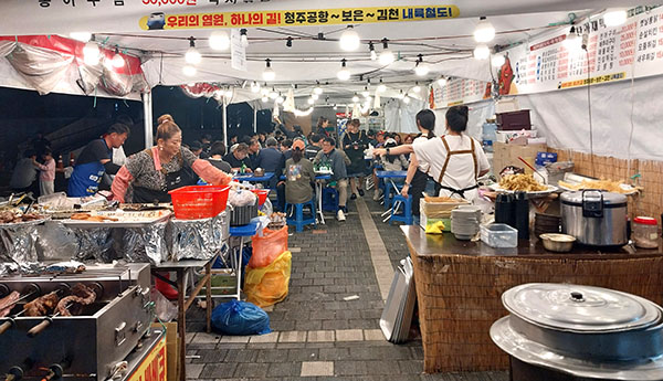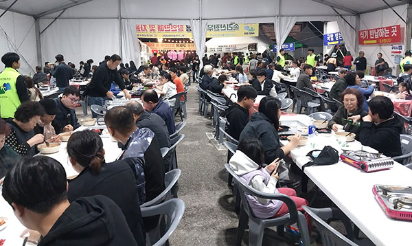 보은문화원 앞에 판을 벌인 먹거리장터(위쪽)와 보은옥천영동축협이 앞마당에 설치한 속리산한우 자율식당. 작년 전매 논란이 불거짐에 따라 올해 먹거리장터에는 엄선된 7개 군내 요식업소가 입점했다. 작년보다 부스당 공간을 넓히고 메뉴 또한 업소별로 차별화를 두었다는 요식업협회원의 설명이다. 입점비용도 소폭 낮추고 음식에 대한 검수도 자체 진행하고 있다고 한다. 관계자는 “작년 전매 문제가 발생해 올해는 신경을 많이 쓰고 매우 엄격한 심사를 하다 보니 입점업체수도 전년 14개 업체에서 절반으로 줄었다”며 “올해 부족한 점이 나타나면 개선하면서 내년 축제는 올해와 또 다른 모습을 선보일 것”이라고 했다. 보은옥천영동축협도 대추축제 기간 동안 400명을 동시에 수용할 수 있는 속리산한우 구이용 할인판매 및 자율식당을 운영하고 있다. 한우는 20% 할인에 등급별로 판매하며 상차림 5000원, 국밥 1만원, 육회 1만원에 손님을 맞이하고 있다. 위 사진은 지난 18일 오후 7시 풍경.