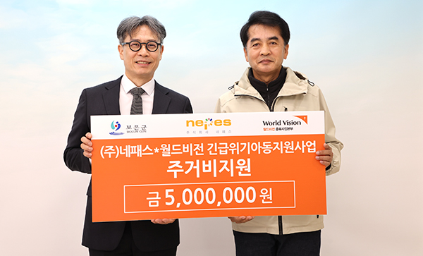 월드비전 충북사업본부(본부장 조성준, 좌측)는 지난 22일 보은군청을 방문해 지역 내 위기아동 가구를 돕기 위한 주거비 300만 원과 후원기업 ㈜네패스의 필수가전제품 지원금 200만 원 등 총 500만 원을 전달했다. 이번 주거환경개선사업의 지원 대상은 조립식 주택에 거주하며 방범이 취약한 환경 속에서 생활하던 아동가구로, 월드비전은 안정적인 주거생활을 위해 보증금을 지원하고 아동이 사용할 수 있는 필수가전제품과 노트북도 함께 전달할 예정이다. 조성준 본부장은 “아동이 건강한 환경에서 성장할 수 있도록 다양한 지원사업을 지속 추진하겠다”며 “이번 지원을 통해 더 많은 아이들이 위기 상황에서 벗어날 수 있도록 최선을 다하겠다”고 말했다. 최재형 보은군수는 “아이들이 안정적인 환경에서 꿈을 키워갈 수 있도록 군에서도 사례관리와 후원 연계를 통해 아동복지 향상에 힘쓰겠다”며 “앞으로도 민관이 함께하는 복지 지원이 지속되길 바란다”고 전했다.