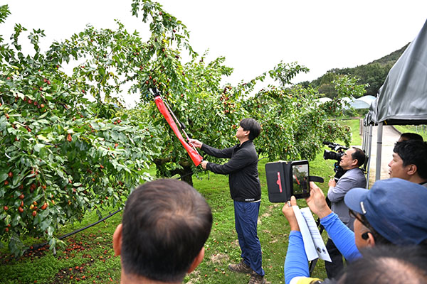 충북농업기술원이 휴대용 대추 수확기를 공개했다. 지난 15일 보은군 산외면 소재 대추연구소에서 농업인과 관계자를 대상으로 ‘대추 신품종 평가회’와 ‘휴대용 수확기 연시회’를 개최했다. 현재 생대추는 손으로 하나씩 수확해야 해 인력 소모가 많고, 높은 곳의 과실은 사다리 작업 중 낙상 위험이 따른다. 이에 대추연구소는 전동식 롤러가 회전하며 과실을 감싸 안전하게 분리하는 ‘휴대용 수확기’를 개발 중이다. 이 장비는 배터리로 구동되며, 롤러의 탄성 소재가 과피 손상을 줄이고 작업자의 피로도를 낮추는 구조로 설계됐다. 연구소는 시제품 검증을 거쳐 특허를 출원하고, 2026년 수확기에 맞춰 농가 보급을 추진할 계획이라고 밝혔다.