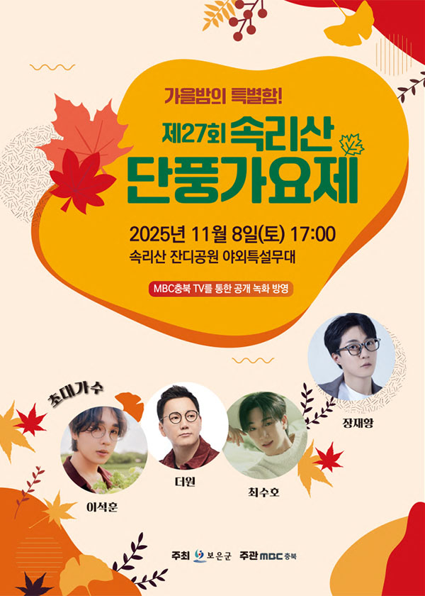 이혜영 문화관광과장은 “가을 정취 가득한 속리산에서 열리는 단풍가요제는 매년 큰 사랑을 받고 있다”며 “많은 분들이 함께해 속리산의 아름다운 가을과 수준 높은 공연을 즐기시길 바란다”고 말했다.