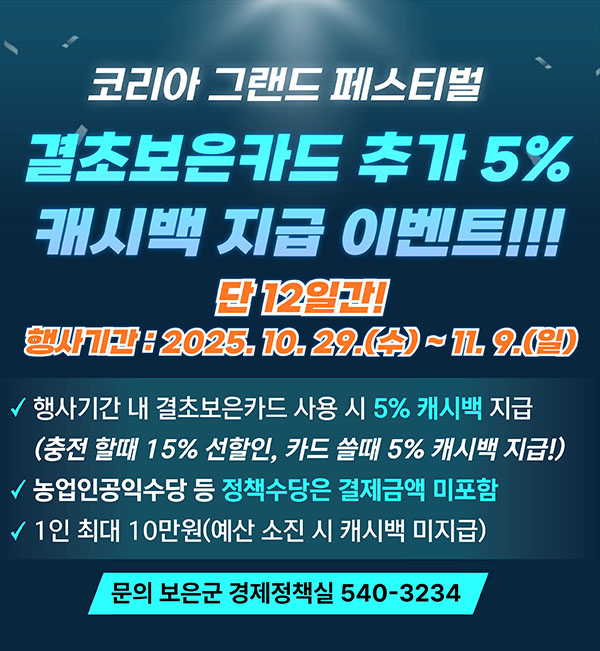 캐시백은 1인 최대 10만 원 한도이며, 예산 소진 시 조기 종료될 수 있다. 행사 종료 후 11월 10일부터 12월 31일까지는 기존 15% 선할인 제도만 유지된다. 자세한 내용은 보은군 홈페이지 및 SNS를 통해 안내될 예정이다.