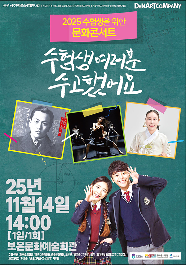 보은군 공연장 상주단체인 단아트컴퍼니(감독 김민우)가 오는 14일 오후 2시 보은문화예술회관에서 ‘2025 수험생을 위한 문화콘서트’를 선보인다.