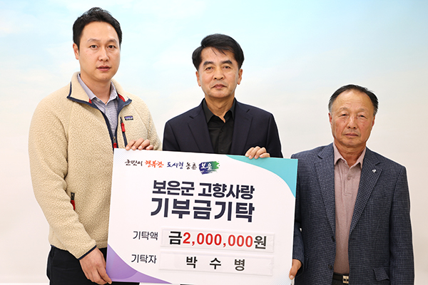 두산그룹에서 연구원으로 근무하고 있는 박수병 씨(왼쪽)는 지난 11월 28일 보은군청을 방문해 고향사랑기부금 200만 원을 기탁했다고 보은군이 알렸다. 박 연구원은 회남면에서 활동 중인 박범선 회남면 지역사회보장협의체 위원장의 아들로 지난해에 200만 원을 기탁한데 이어 올해도 고향과 지역사회 발전을 위해 기부에 동참했다. 박수병 씨는 “고향에서 늘 많은 관심과 응원을 보내주신 만큼 지역사회에 조금이나마 도움이 되고 싶었다”며 “앞으로도 보은군에 보탬이 될 수 있는 나눔을 이어가겠다”고 말했다. 이에 최재형 보은군수는 “꾸준히 고향을 기억하고 나눔을 실천해 주신 데 깊이 감사드린다”며 “기탁된 기부금은 지역 주민 복지 향상을 위해 투명하게 활용하겠다”고 밝혔다. 보은군은 고향사랑기부금 제도를 통해 기부자에게 답례품 제공 및 세액공제 혜택을 제공하고 있다. 군은 앞으로도 지역 인구 감소와 공동체 약화를 극복하기 위해 기부 참여를 확대해 나갈 계획이다.