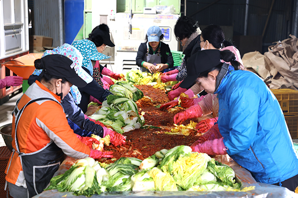 삼승면 우진리에서 ‘삼승황토사과방’을 운영하는 이재술·김명례 부부도 지난 11월 27일 6년째 변함없이 직접 담근 15kg 김장김치 70박스를 삼승면에 기부하며 이웃사랑을 실천했다. 이날 기부된 김치는 관내 경로당과 저소득층에 전달돼 겨울철 식생활 부담을 덜어주고 따뜻한 겨울나기에 도움을 줄 전망이다. 사진은 이재술·김명례씨 부부가 외국인노동자와 면직원들과 함께 김장을 하고 있는 모습.