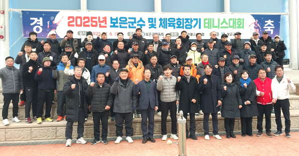 2025년 보은군수 및 체육회장기 테니스대회가 지난 6일 보은군생활테니스공원 테니스장에서 열렸다. 보은군테니스협회(협회장 권오제)가 주관한 이번 대회에는 시니어클럽, 청심클럽, 보은테니스크럽 A와 B팀, 한사랑, 속리산클럽 등 6개 팀 60여 명이 5복식 경기를 치르며 친선을 도모했다. 경기는 1위 속리산테니스(대표 이태호), 2위 보은클럽(대표 윤석구), 3위 청심클럽(대표 박호범)이 차지했다. 권오제 회장은 대회사를 통해 “그동안 갈고닦은 실력을 유감없이 발휘하지 마시고 오늘은 동호회 선후배끼리 우정과 화합하는 훈훈한 자리가 되었으면 하며 얼마 남지 않은 한해 마무리 잘 하시고 앞으로도 쭉 건강 잘 챙기시길 바란다”고 인사했다. 사진은 회원 및 내외빈들이 테니스대회 개막식 후 단체로 추억에 남길 사진 한 장을 찍고 있다.