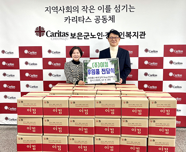 ㈜이킴(대표 유민)은 지난 9일 보은군노인장애인복지관(관장 박종분)에 배추김치 1,250kg을 후원하며 훈훈한 나눔을 실천했다. 이번 후원은 지난해에 이어 두 번째로 지역 내 취약계층의 겨울철 건강한 식생활을 지원하고자 하는 뜻을 담고 있다. 이날 후원받은 김치 1,250kg은 보은군노인장애인복지관에서 지역 어르신과 장애인 250가정에 전달될 예정이다. 유민 대표는 “작년에 이어 올해도 지역 어르신들을 위해 나눔을 이어갈 수 있어 뜻깊다. 앞으로도 도움이 필요한 곳에 실질적인 지원을 지속하며 지역과 따뜻하게 연결되는 기업이 되겠다”고 전했다. 박종분 관장은 “(주)이킴이 작년에 이어 올해도 잊지 않고 나눔을 실천해 줘 큰 힘이 됐다”며 “겨울철 어르신들이 따뜻하게 지낼 수 있도록 김치를 소중히 배부하겠다”고 말했다.