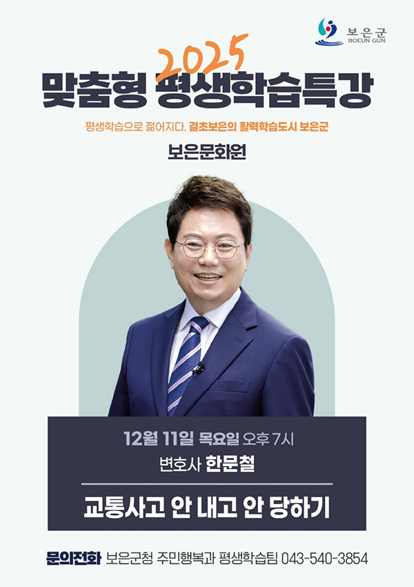 보은군이 군민들의 안전 의식 강화와 교통사고 예방을 위해 교통사고 전문 변호사 한문철을 초청해 특별 강연을 연다. 11일 오후 7시 보은문화원 1층 시청각실에서 한문철 변호사의 ‘교통사고 안 내고, 안 당하기’를 주제로 한 강연이다.