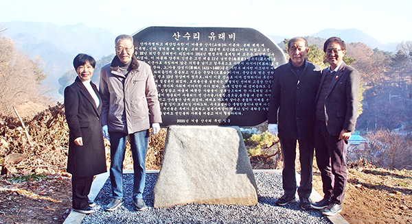 “그 후 입향한 타 성씨들과 좋은 유대관계를 맺고 지냈다. 인정 많고 마음씨 따뜻한 사람들이 상부상조하며 한 가족처럼 모여 살던 마을이 1980년 대청댐이 완공되어 수몰되기 전, 산수골, 아랫말, 분토골, 불무골 네 곳의 자연부락 중 산수골만 님게 되었다. 대대로 바르게 살아온 분들이 지혜를 본받아 광풍제월의 산수 자연을 길이 보존하기 바라노라. 수구초심하는 출향인들이나 현재 마을을 지키고 살아가는 주민들은 우애가 돈독하고 형제자매 같이 지내니 길이 복락을 누릴 것이다. 먼 훗날에도 선인들의 자취를 머금고 여기 영원하리라. 2025년 겨울 산수리 주민 일동”이라고 쓰여있다.