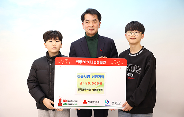 종곡초등학교 학생회(학생회장 장인수)는 학교 텃밭에서 직접 재배한 고구마를 판매하고 마련한 수익금 45만 6000원 전액을 어려운 이웃을 위해 써달라며 보은군에 기탁했다. 이번 성금은 학생들이 씨를 심고 가꾸며 수확한 고구마를 판매해 마련한 것으로, 학생들은 나눔의 의미를 몸소 실천하며 이웃사랑의 가치를 되새겼다. 장인수 학생회장은 “친구들과 함께 농사지은 결실을 판매해 그 수익금을 이웃을 위해 기탁할 수 있어 뿌듯하다”며 “작은 정성이지만 꼭 필요한 곳에 쓰이길 바란다”고 기탁 소감을 전했다. 이에 최재형 보은군수는 “추운 날씨 속에서도 이웃을 생각하는 따뜻한 마음이 모여 보은군의 겨울을 더욱 훈훈하게 만든다”며 “학생들의 소중한 마음이 담긴 성금은 어려운 이웃들이 따뜻한 겨울을 보낼 수 있도록 잘 전달하겠다”고 말했다. 군은 이날 기탁된 성금을 충북사회복지공동모금회를 통해 군내 저소득 가정에 지원할 예정이라고 했다. 사진 좌측부터 김민성 학생부회장, 최재형 보은군수, 장인수 학생회장 종곡초등학교.