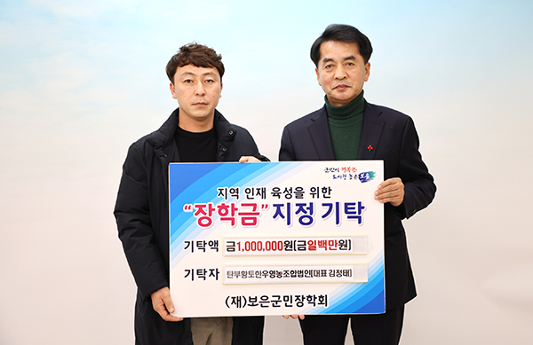 탄부황토한우영농조합법인(대표 김정태, 사진 좌측))은 지난 26일 지역 인재 육성을 위해 장학금 100만 원을 보은군민장학회에 기탁했다. 이번 기탁은 지역의 미래를 이끌어갈 인재 양성에 힘을 보태기 위해 마련됐으며, 전달된 장학금은 보은군 인재 육성 사업에 활용될 예정이라고 한다. 김정태 대표는 “지역에서 받은 관심과 성원에 보답하고자 작은 정성이지만 장학금을 전달하게 됐다”며 “학생들이 자신의 꿈을 키워 나가는 데 도움이 되길 바란다”고 말했다. 최재형 장학회 이사장이자 보은군수는 “지역 인재 육성을 위한 뜻깊은 나눔에 감사드린다”며 “기탁해 주신 장학금은 학생들의 꿈과 희망을 키우는 데 소중히 사용하겠다”고 전했다.