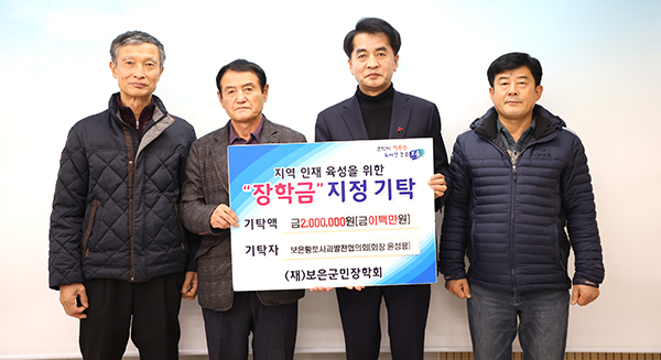 보은황토사과발전협의회(회장 윤성용)는 지난 2일 보은군청을 방문해 지역 인재 육성을 위한 장학금 200만 원을 보은군민장학회에 기탁했다. 이번 장학금은 지역의 미래를 이끌 인재를 발굴·육성하는 데 보탬이 되고자 마련된 것으로, 기탁된 성금은 보은군민장학회를 통해 지역 인재 육성 사업에 사용될 예정이다. 윤성용 회장은 “지역 농업을 이끌어온 단체로서 지역사회에 환원하는 것이 중요하다고 생각했다”며 “이번 장학금이 지역 학생들이 꿈을 키워가는 데 작은 힘이 되길 바란다”고 말했다. 최재형 군수는 “지역 인재 육성을 위해 뜻을 모아주신 보은황토사과발전협의회에 감사드린다”며 “기탁해 주신 장학금은 보은의 미래를 이끌 인재 양성을 위해 소중히 활용하겠다”고 전했다.