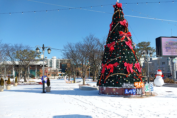 뱃들공원에 적은 적설량이지만 쌓인 눈이 겨울임을 실감케 하고 있다. 11일 오전 풍경.