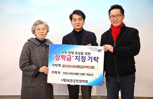 가가스카이크레인 박정숙 대표는 지난 13일 보은군청을 방문해 지역 인재 육성을 위해 사용해 달라며 장학금 200만원을 기탁했다. 박 대표는 “지역에서 받은 사랑을 다시 지역에 돌려드리고 싶었다”며 “이번 장학금이 보은의 미래를 이끌어갈 학생들이 꿈을 키워가는 데 작은 디딤돌이 되길 바란다”고 말했다. 최재형 보은군수는 “지역 인재 육성을 위해 뜻을 모아주신 박정숙 대표님께 깊이 감사드린다”며 “기탁해 주신 장학금은 학생들이 학업에 전념하고 꿈을 실현하는 데 소중히 사용하겠다”고 감사의 뜻을 전했다. 사진 좌측부터 박정숙 대표, 최재형 군수, 배우자 진용석 씨.