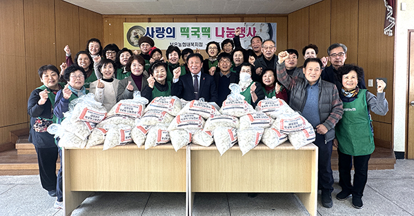 보은농협 고향주부모임 내북면지회(회장 김광자)는 지난 7일 새해를 맞아 보은농협 내북지점 2층 회의실에서 ‘사랑의 떡국떡 나눔행사’를 실시했다. 이 행사는 지역 어르신들께 새해 인사를 전하고 이웃 간 따뜻한 정을 나누기 위해 마련됐다. 이날 고향주부모임 회원들은 전날부터 정성껏 준비한 떡과 직접 빚은 만두로 떡국을 끓여 각 마을 경로당에 전달했다. 이날 행사에는 내북면 노인회장, 이장협의회장, 영농회장, 내북면장 등이 참석해 어르신들과 새해 덕담을 나누는 뜻깊은 시간도 됐다. 김광자 회장은 “새해를 맞아 어르신들께 따뜻한 떡국떡을 나누며 새해 인사를 전할 수 있어 기쁘게 생각한다”며 “이 행사가 매년 이어질 수 있도록 지원을 해준 보은농협에도 감사의 마음을 전한다”고 말했다. 서정만 조합장은 “고향주부모임 내북면지회 회원들의 마음을 모아 정성껏 준비한 떡국떡 나눔행사가 어르신들께 따뜻한 정과 희망이 전해지는 새해의 시작이 되시길 바란다”며 “앞으로도 보은농협은 지역사회와 함께하는 나눔 활동을 지속적으로 이어가겠다”고 말했다.