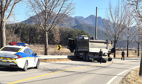 지난 8일, 보은읍 장안면 길상리앞 25번 국도에서 25톤 트럭이 방호벽을 받고 멈춰서는 사고가 발생했다.