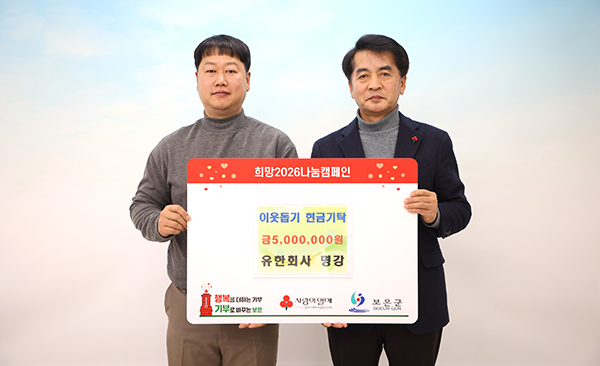 유한회사 명강(대표 장재민, 사진 좌측)은 지난 20일 보은군청을 방문해 군내 저소득층 가구에 사용해 달라며 500만원을 기탁했다. 이번 성금은 경제적 어려움을 겪고 있는 취약계층 가구의 생활 안정과 복지 증진을 돕기 위해 마련됐다. 기탁된 성금은 관내 저소득층을 위한 복지사업에 활용될 예정이다. 장재민 대표는 “작은 정성이지만 도움이 필요한 이웃들에게 희망이 되기를 바라는 마음으로 성금을 전달하게 됐다”며 “앞으로도 지속적으로 따뜻한 나눔을 이어갈 수 있도록 노력하겠다”고 말했다. 최재형 보은군수는 “어려운 시기에도 이웃을 생각해 주신 마음에 진심으로 감사드린다”며, “성금은 꼭 필요한 분들게 소중히 전달하겠다”고 감사의 뜻을 전했다.