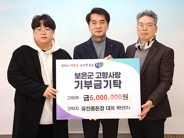 유진종돈장을 운영하고 있는 박선자 대표가 지난 16일 보은군청을 방문해 고향사랑 기부금 500만 원을 기탁했다. 이날 기탁식에는 박선자 대표를 대신해 배우자인 배병규 공동대표(전 보은군골프협회장)가 참석해 기부금을 전달했다. 배병규 공동대표는 “보은군은 삶의 터전이자 늘 마음에 두고 있는 고향”이라며 “고향사랑기부제가 지역 발전과 주민 복지에 도움이 되길 바라는 마음으로 기탁을 결정하게 됐다”고 말했다. 이에 최재형 군수는 “보은군을 향한 따뜻한 애정과 관심으로 고향사랑기부에 동참해 주셔서 감사드린다”며 “기탁해 주신 소중한 기부금은 군민 복지 증진과 지역 발전을 위해 의미 있게 사용하겠다”고 답했다. 사진 우측부터 배병규 대표, 최재형 군수, 배 대표의 아들.