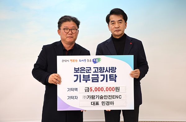 (주)가람기술안전ENC 민경아 대표(좌측)는 지난 22일 보은군청을 방문해 고향사랑 기부금 500만 원을 기탁했다. 이번 기탁은 고향사랑기부제의 취지에 공감해 이뤄진 것으로, 지역에 대한 애정과 상생의 마음을 나누는 의미 있는 나눔으로 평가받고 있다. 민경아 대표는 “고향사랑기부제를 통해 지역에 작게나마 보탬이 되고 싶었다”며 “앞으로도 지역사회와 함께 성장하는 기업으로서 사회적 책임을 다하겠다”고 기탁 소감을 밝혔다. 이에 최재형 군수는 “고향사랑기부제의 취지에 공감해 따뜻한 나눔을 실천해 주신 데 깊이 감사드린다”며 “기부금은 군민의 삶에 실질적인 도움이 될 수 있도록 지역 발전과 주민 복지 증진을 위해 소중히 활용하겠다”고 답했다. 한편, 고향사랑기부제는 개인이 주소지를 제외한 지방자치단체에 기부하면 세액공제 혜택과 함께 지역 특산품 등 답례품을 받을 수 있는 제도로, 지역 재정 확충과 지역경제 활성화에 기여하고 있다.