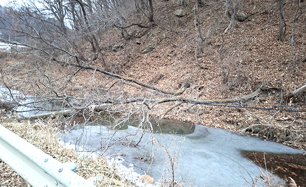 지난 15일, 수한면 차정리(이장 박광일) 항건천변에 쓰러진 나무가 통신선을 누르고 있어 용촌차정로를 오가는 주민들이 사고를 염려하며 눈살을 찌푸리게 하고 있다.