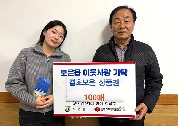 보은읍 강신1리 김응주 이장(사진 우측)은 지난 2일 보은읍 행정복지센터를 방문해 읍내 도움이 필요한 이웃들에게 전달해 달라며 결초보은 상품권 100매(100만 원 상당)를 기탁했다. 이번 기탁은 명절을 앞두고 경제적으로 어려움을 겪고 있는 이웃들에게 실질적인 도움을 전하고자 마련된 것으로, 지역 공동체를 위해 앞장서 온 이장의 마음이 담겼다고 한다. 김응주 이장은 “설을 앞두고 이웃들이 조금이나마 따뜻한 명절을 보내는 데 도움이 되길 바란다”며 “앞으로도 마을과 지역을 위해 할 수 있는 나눔을 계속 이어가고 싶다”고 말했다. 황대운 보은읍장은 “지역을 위해 늘 애써 주시는 이장님의 노력과 헌신에 깊이 감사드린다”며 “기탁해 주신 상품권은 도움이 필요한 이웃들에게 소중히 전달하겠다”고 말했다. 이날 기탁된 결초보은 상품권은 읍내 기초생활수급자 등 생활이 어려운 가구를 중심으로 전달될 예정이다.