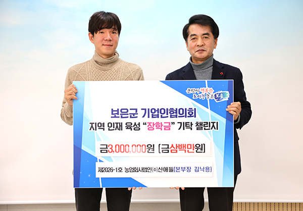 농업회사법인 (주)산애들(본부장 김낙용, 사진 좌측)은 지난 1월 29일 보은군청을 방문해 지역 인재 육성을 위한 장학금 300만 원을 (재)보은군민장학회에 기탁했다. 이번 장학금 기탁은 보은군 기업인협의회가 지역사회에 대한 환원과 나눔 실천을 위해 추진 중인 ‘기업인 장학금 기탁 챌린지’에 농업회사법인 ㈜산애들이 동참하며 이뤄졌다. 해당 챌린지는 올해로 3년째를 맞았으며, 매년 지역 기업들의 자발적인 참여로 선행이 이어지고 있다. 특히 경기 여건이 어려운 상황에서도 지역 인재 육성을 위한 기업인들의 따뜻한 마음이 지속적으로 모이며, 지역사회에 나눔 문화 확산과 상생의 가치를 전하고 있다는 점에서 의미를 더하고 있다. 김낙용 본부장은 “지역에서 성장한 기업으로서 지역사회에 보답하고자 이번 장학금 기탁에 참여하게 됐다”며 “학생들이 꿈을 키워가는 데 작은 힘이 되길 바란다”고 말했다. 최재형 보은군수는 “기업인협의회 장학금 기탁 챌린지에 동참해 주신 산애들에 감사드린다”며 “지역 기업과 함께 인재를 키우는 선순환 구조를 더욱 확대해 나가겠다”고 말했다. 한편, 보은군 기업인협의회는 장학금 기탁 챌린지를 통해 2024년에는 12개 기업이 참여해 총 3,300만 원을, 2025년에는 11개 기업이 총 3,100만 원을 각각 기탁한 바 있다.