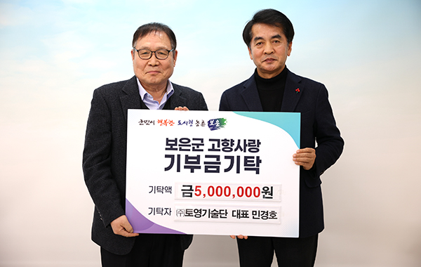 ㈜토영기술단 민경호 대표(좌측)는 지난 1월 30일 보은군청을 방문해 고향사랑기부금 500만원을 기탁했다. 민 대표는 지난해에도 500만 원을 쾌척한 데 이어 올해도 다시 한번 기탁에 동참하며 변함없는 애정을 보였다. 측량 및 토목 엔지니어링 전문 업체인 ㈜토영기술단은 평소에도 지역 인재 양성을 위한 장학금을 꾸준히 기탁하는 등 사회공헌 활동의 모범이 되고 있다. 민경호 대표는 “내 고향과도 같은 보은의 발전에 힘을 보탤 수 있어 매우 뜻깊게 생각한다”며, “이 기부금이 보은의 미래를 밝히는 소중한 자산이 되어, 군민 모두가 행복하고 살기 좋은 ‘도시형 농촌 보은’을 만드는 데 보탬이 되길 바란다”고 소감을 밝혔다. 최재형 보은군수는 “잊지 않고 보은군에 온정을 보내주시는 민경호 대표님께 진심으로 감사드린다”며 “기탁해주신 소중한 기부금은 지역 경제 활성화와 주민 복지 증진을 위한 마중물로 삼아, 군민이 체감할 수 있는 변화를 만드는 데 최선을 다하겠다”고 답했다.