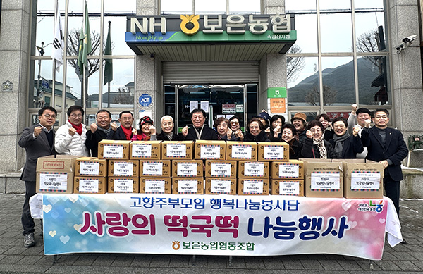 보은농협(조합장 서정만) 고향주부모임 속리산면지회(회장 이영자)는 지난 4일 지역 내 취약계층을 대상으로 ‘사랑의 떡국떡 나눔행사’를 실시했다. 이번 행사는 지역 이웃들에게 따뜻한 정을 전하고 나눔 문화를 실천하고자 마련됐는데, 속리산면지회 회원들은 정성껏 준비한 떡국떡을 각 마을회관과 취약계층 가구에 전달했다. 이영자 회장은 “회원들과 함께 뜻깊은 나눔을 실천할 수 있어 매우 보람을 느낀다”며, “행사가 원활히 진행될 수 있도록 지원을 아끼지 않은 보은농협에도 감사드린다.”고 말했다. 서정만 조합장은 “고향주부모임 속리산면지회 회원들이 지역을 위해 꾸준히 이어온 나눔 활동에 깊이 감사드린다”며 “보은농협은 앞으로도 지역과 함께하는 다양한 사회공헌 활동을 지속적으로 추진해 나가겠다”고 말했다.