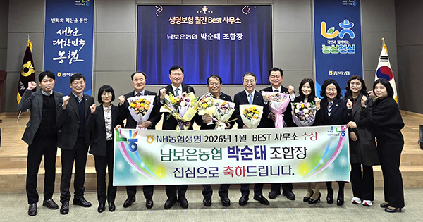 농협충북본부에서 지난 4일, 남보은농협 박순태 조합장이 ‘충북 농축협 1월 베스트(BEST) 사무소’ 수상자로 선정됐다고 밝혔다. ‘충북 농축협 월간 베스트 상’은 NH농협생명에서 생명보험사업 추진을 통해 농업인의 실익 증대 및 경제적 지위 향상에 기여한 농·축협 조합장에게 주어진다. 남보은농협은 생명보험 추진을 통한 비이자수익 증진으로 우수한 경영실적을 보여주고 있으며, 1월에 충북 농축협 중 생명보험추진 1위를 차지했다. 박순태 조합장은 "이번 성과는 모든 임직원의 노력 덕분이기에 함께 해 준 직원들에게 감사드리며, 언제나 남보은농협을 사랑해 주시고 사업에 적극적으로 참여해 주시는 조합원들과 고객들에게도 감사 드린다“며, 남보은농협은 전 임직원들이 최선의 노력을 통해 조합원과 고객이 믿고 찾을 수 있는 농협이 되도록 힘쓸 것”이라고 말했다.