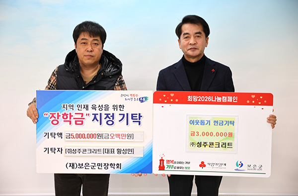 ㈜성주콘크리트 황성민 대표(좌측)는 지난 5일 보은군청을 방문해 지역인재 육성과 이웃사랑 실천을 위해 장학금 500만 원과 이웃돕기 성금 300만 원 총 800만 원을 기탁했다. 성주콘크리트는 탄부면 상장리에 2005년 10월 입주해 콘크리트 제품(수로관 등)을 제조하는 업체로, 매년 장학금 기탁, 이웃사랑 성금 등을 통해 지역을 위한 나눔의 실천을 꾸준히 이어가고 있다. 황성민 대표는 “장학금과 이웃돕기 성금이 보은군 학생들과 어려운 이웃들에게 조금이나마 도움이 되길 바란다”며 “앞으로도 지역사회 발전과 주민 행복을 위해 지속적인 나눔 활동을 이어가겠다”고 말했다. 최재형 보은군수는 “지역 인재 육성과 이웃사랑을 위한 따뜻한 나눔을 실천해 주신 데 깊이 감사드린다”며 “이번 기탁이 학생들과 어려운 이웃들에게 큰 힘이 될 것”이라고 전했다.