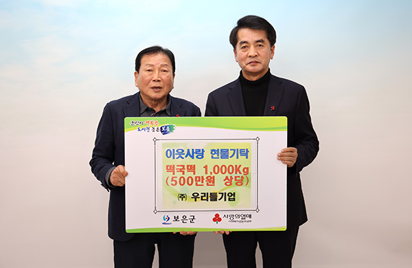 ㈜우리들기업 이무석 대표(좌측)는 지난 9일 보은군청을 방문해 군내 저소득층과 사회복지시설 지원을 위한 떡국떡 1,000kg(500만 원 상당)을 기탁했다. 우리들기업은 청주시 서원구에 소재한 유통업체(방송장비 등)로 지역사회를 위한 나눔 활동을 꾸준히 이어오고 있다. 특히 지난해에도 보은군에 떡국떡 1,000kg을 기탁하는 등 이웃사랑 실천에 앞장서고 있다. 이무석 대표는 “작은 정성이지만 어려운 이웃들이 따뜻한 마음으로 식탁을 채우는 데 보탬이 되길 바란다”며 “앞으로도 지역사회와 함께하는 나눔 활동을 지속해 나가겠다”고 말했다. 최재형 보은군수는 “매년 잊지 않고 이웃을 위한 나눔을 실천해 주시는 ㈜우리들기업 이무석 대표님께 감사드린다”며 “기탁해 주신 물품은 도움이 필요한 이웃들에게 소중히 전달하겠다”고 말했다. 이날 기탁한 떡국떡은 군내 저소득 가구와 사회복지시설에 전달될 예정이다.