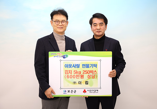 ㈜이킴 유민 대표(좌측)는 10일 보은군청을 방문해 설 명절을 맞아 어려운 이웃에게 전달해 달라며 김치 5kg 250상자(600만 원 상당)를 보은군에 기탁했다. 이킴은 보은읍과 삼승면에 소재한 김치 제조업체로 매년 군내 저소득층과 사회복지시설에 김치를 기탁하는 등 지역사회 나눔 활동을 꾸준히 이어오고 있다. 특히 지난해 화재로 인한 재산 피해를 겪는 어려운 상황 속에서도 이웃을 위한 나눔을 실천해 의미를 더하고 있다. 유 민 대표는 “어려운 시기일수록 서로를 돌보는 마음이 중요하다고 생각한다”며 “이번 기탁이 설 명절을 앞둔 이웃들에게 조금이나마 도움이 되길 바란다”고 말했다. 최재형 군수는 “지역사회를 위한 따뜻한 나눔을 실천해주신 유민 대표께 감사드린다”며 “기탁해 주신 물품은 도움이 필요한 이웃들에게 정성껏 전달하겠다”고 말했다. 이날 기탁된 김치는 충북사회복지공동모금회를 통해 관내 사회복지시설과 저소득층 가구에 지원될 예정이다.