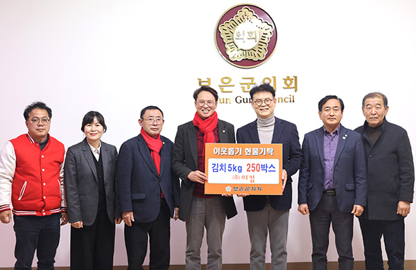 보은군의회(의장 윤대성)는 지난 5일 ㈜이킴(대표 유민)으로부터 지역 저소득층 가구를 지원하기 위한 김치 4kg 250박스(625만원 상당)를 전달받고 기탁식을 가졌다. 이번 기탁식은 지역사회 소외계층 지원과 이웃사랑 실천을 위해 ㈜이킴의 김치 나눔 기탁을 받아 추진됐다. 지난해에 이어 올해도 ㈜이킴의 적극적인 동참과 협력 덕분에 이루어졌다고 한다. 윤대성 의장은 “매년 지역의 어려운 이웃들을 위해 나눔 활동에 동참해주시는 ㈜이킴에 깊은 감사를 드린다”며 “보은군의회는 앞으로도 지역사회 나눔 문화 확산과 소외계층 지원을 위한 다양한 정책을 적극 발굴하여 군민 모두가 행복한 보은군을 만들어 가겠다”고 밝혔다. 유민 대표는 “작년과 마찬가지로 보은군의회의 적극적인 지원과 관심 덕분에 뜻깊은 나눔을 이어갈 수 있게 되었다”며 “앞으로도 지역사회 일원으로서 어려운 이웃들을 위한 다양한 나눔 활동에 의회와 지속적으로 협력해 나가겠다”고 말했다. 이날 전달된 김치는 군의 협조를 통해 연송 적십자, 시각장애인 단체와 농아인 단체에 전달되어 관내 저소득 소외계층에 신속히 배부될 계획이다.