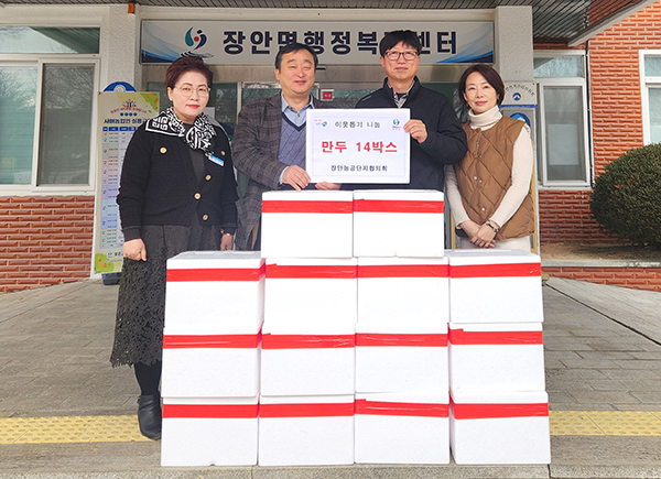 보은군 장안농공단지협의회(회장 정태원)는 지난 11일 장안면 행정복지센터를 방문해 지역 주민들을 위해 써 달라며 만두 14박스를 기탁했다. 이번 기탁은 설 명절을 앞두고 지역 내 경로당을 이용하는 주민들이 따뜻하고 풍성한 명절을 보내길 바라는 마음을 담아 마련됐다. 정태원 장안농공단지협의회장은 “관내 이웃들이 설 명절을 보다 따뜻하게 보내길 바라는 마음으로 회원들과 뜻을 모았다”며 “앞으로도 지역사회와 함께하는 나눔을 이어가겠다”고 말했다. 이덕만 장안면장은 “매 명절마다 잊지 않고 전해주시는 따뜻한 나눔에 깊이 감사드린다”며 “기탁해 주신 만두는 관내 14개소 경로당에 소중히 전달하겠다”고 말했다. 이날 기탁된 만두는 관내 14개소 경로당에 지원될 예정이다.